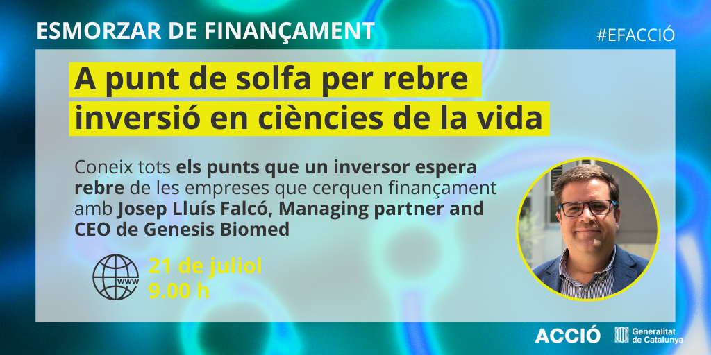 ACCIÓ is organising the online Financing Breakfast Ready and waiting to receive investment in life sciences, with special guest Josep Lluís Falcó, CEO at Genesis Biomed, on 21 July.